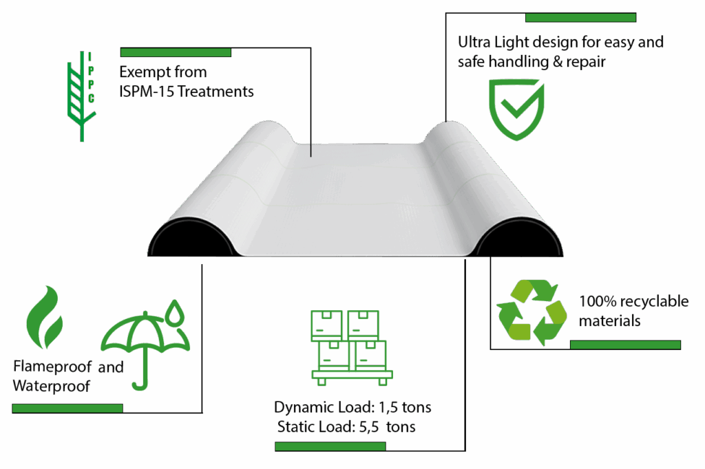 Yes. It’s made from 100% recycled materials, as well as being recyclable at the end of its useful life, thereby supporting a circular economy. For every six flex-pallets™ used, 1 fully mature tree is spared. By significantly cutting fuel consumption and allowing for more efficient shipments, it also helps lower the carbon footprint of your entire supply chain.